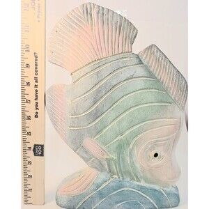 Hand carved hand painted multicolor pastel wooden fish statue measuring 12.5 inches in height and 8.5 inches in width.