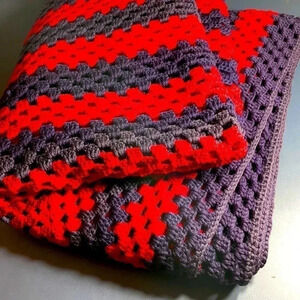 VTG Hand Crafted Crocheted Afghan Blanket Throw Blue & Red Homemade