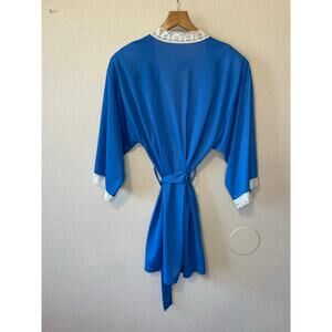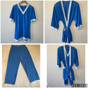 VTG Hand Made Blue Lace Trim 3 Piece Pajama Sleep Set Robe Shirt & Pants Small