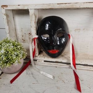 VTG Hand Painted Black & Red Ceramic Face Mask Wall Decor- Mardi Gras Masquerade