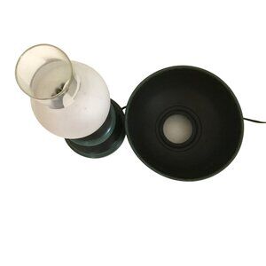 This unique vintage folk art table lamp features a beautifully hand-painted metal shade and base adorned with whimsical angel motifs, as well as a frosted glass hurricane insert.