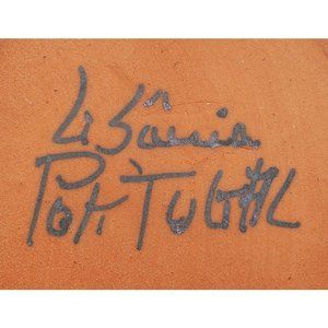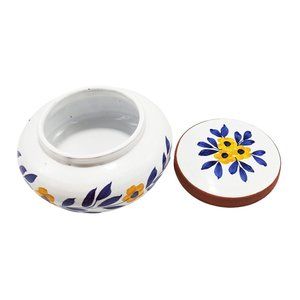 VTG Hand Painted Redware Round Trinket Box Portugal White Blue Yellow Signed