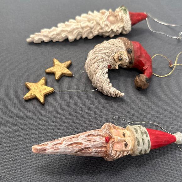 Set of 3 vintage hand-painted Santa face ornaments in rustic folk art style. Includes one crescent moon Santa with two dangling gold stars and two elongated icicle Santas with sculpted beards and red hats. Detailed facial carving and painted texture give an old-world, hand-crafted look. Strings attached for easy hanging. Made in China. Lightweight resin composition with matte finish.