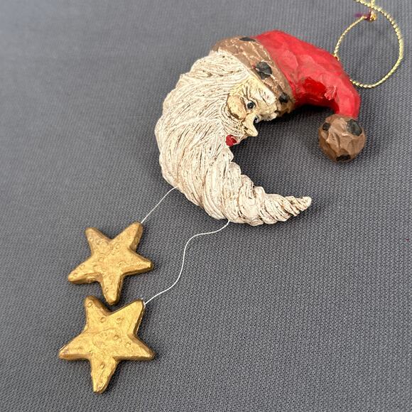 VTG Hand Painted Santa Face Ornament set 3 Red Hat Folk Art Moon Stars Resin 90s
