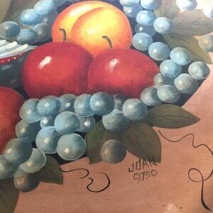 Vintage hand-painted tole tray signed Joan 9750, featuring a bold fruit still life with a bluebird.