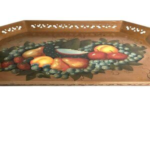 VTG Hand Painted Tin Serving Tray Fruit Grapes Bird Signed Joan 22" x 16" Heavy