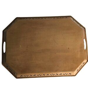 Large and heavy tin piece with cut-out handles and pierced edging, perfect for serving or display.