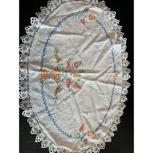 VTG- Hand stitched Needlepoint- floral colorful details- white table doily