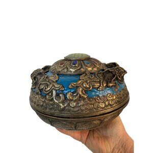 This ornate Tibetan-style lidded insense / trinket bowl features intricate metal work, vibrant turquoise and coral enamel, and a jade centerpiece. A decorative and functional piece with cultural charm.