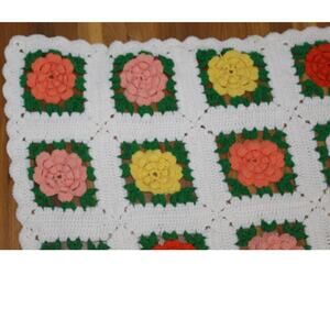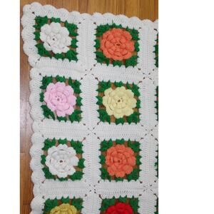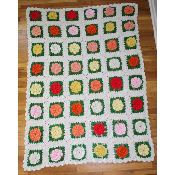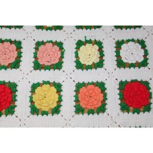 VTG Handmade 3D Crochet Multicolor Rose Flowers Granny Square Afghan 51”x66”
