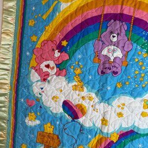 VTG Handmade Care Bears Baby Blanket Quilt Mat Newborn Infant Flannel 32”x 41”