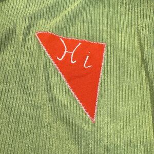 -Unique half-and-half design: one side solid ribbed green fabric with patches, the other side a geometric zigzag pattern in orange, green, pink, and navy tones