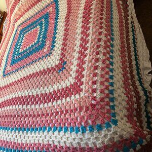 VTG Handmade Crochet Granny Square Afghan Blanket Pink Blue White Cozy Home