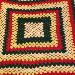 Handmade Cottagecore Grannycore Style Granny Square Style Crochet Throw Blanket. Has a Red, Green, White and Yellow Pattern.
