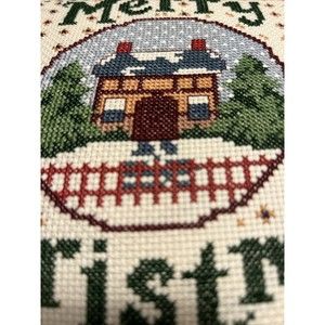 VTG Handmade Cross Stitched Merry Christmas Throw Pillow Cottage.