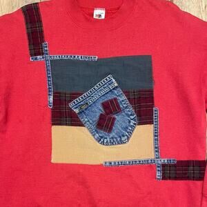 VTG Handmade Denim Pocket Crewneck Sweatshirt Patchwork Fruit Of The Loom USA LG