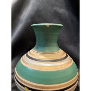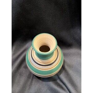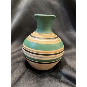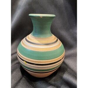 This is a vintage handmade and hand-painted clay bud vase from the 1980s. The vase features a swirl pattern and multicolor design, with a height of 5.25 inches and a length and width of 4 inches. The vase is stamped with "NCWS PROJECT" and is an original piece of decorative art from the late 20th century. It was produced in the United States using pottery techniques and has a painted finish. The vase is an abstract art piece that would make great decor for any room. Please see all the pictures there are flaws but still a great piece & can be displayed & not see the flaws.