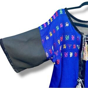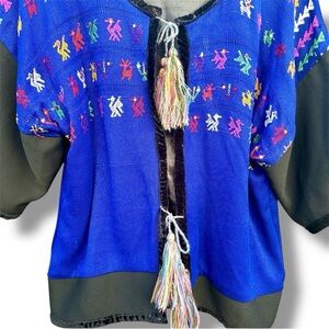 This cardigan is a handmade Mexican Guatemalan huipil cardigan, featuring a thick cotton for the outerwear and satin lining for warmth. The blue and black color and short sleeves with velvet trim make it a versatile piece that can be worn by women in size M-L best. Made in Mexico, this unique garment reflects traditional Latin American craftsmanship and style, perfect for any individual looking to add a touch of cultural flair to their wardrobe.