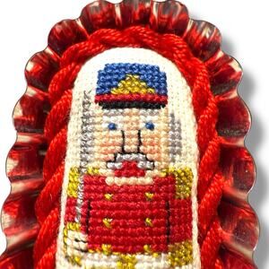 VTG Handmade Needlepoint Nutcracker Christmas Ornament Swedish Tart Pan Frame