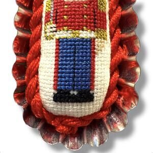 This vintage handmade needlepoint Nutcracker Christmas ornament features a unique Swedish tart pan frame in an oval shape. The multicolor design depicts a Nutcracker soldier character, perfect for adding a festive touch to your holiday decor. Made from a combination of tin, fabric, yarn, and thread, this artisan designed ornament is embellished with metallic accents and is sure to stand out in your collection. Hanging and measuring approximately 3.5" in height, this one-of-a-kind piece is a charming addition to any Christmas ornament display.