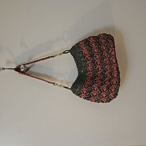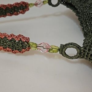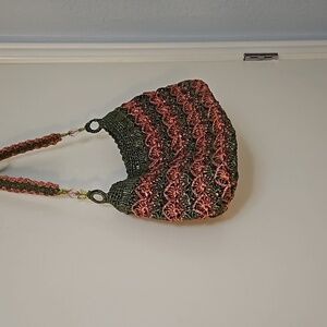 VTG Handmade Olive Pink Woven Crochet Plarn Shoulder Bag
