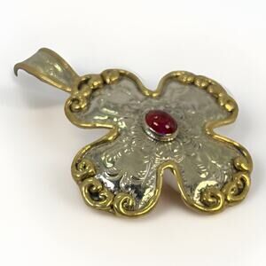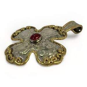 VTG Handmade Silver Tone Copper Edge Red CZ Victorian Revival Cross Pendant 22g Total Weight