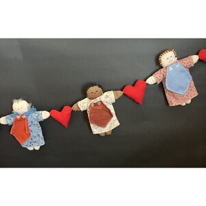 Ragdolls and handsewn hearts make up all 42" of this garland. Good for one 'normal' width doorway, over a bulletin board or something. I like this creation, it celebrates diversity! It gives WE ARE THE WORLD vibes... some stretching in the stitching from decades of use. Wear consistent with age.