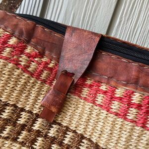 Handwoven sisal tote bag with genuine leather handles and rustic trim. The structured woven design features warm natural tones of tan, brown, and red with secure zip-top closure. Spacious enough for market days, travel, or everyday use, this artisanal piece combines durability and boho charm.
