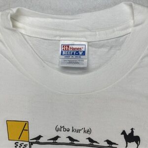 This vintage Hanes Beefy T-Shirt features a unique graphic print with a hot air design, adding a touch of Southwestern and Bohemian style to your wardrobe. The crew neck and regular fit make this white XL shirt comfortable to wear, while the single stitch construction ensures durability.