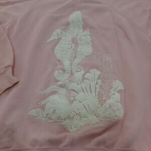 VTG Hanes Sweater Womens Large Seahorse Puff Paint Pink Graphic USA Made 90s. Good preowned condition. Light discoloration on sleeve. See pics for measurements and details.
