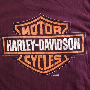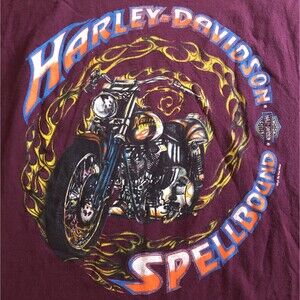 Vintage 90s Harley Davidson SPELLBOUND Single Stitch 100% Cotton, USA Made, Fun Wear Burgundy Short Sleeved T-Shirt. Ring of Flames Motorcycle Front Graphic. Large Bar & Shield Harley Davidson Motorcycles Logo Back Graphic.