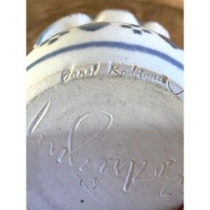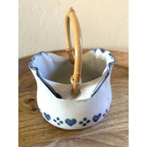 Vintage Blue and white handmade pottery basket with heart design. Made and signed by Janet Rodriguez for Hart Street Pottery. Fluted edges, bamboo handle, blue heart design. Basket is 4.25" diameter x 4" tall, handle adds another 2". Approximately. Excellent condition.
