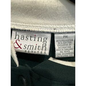 The Hastings & Smith women's Petite M green cardigan is cozy and stylish. Made with a warm fleece lining and button appliqué, this polyester blend sweater is perfect for any occasion. Comes from a smoke free home.