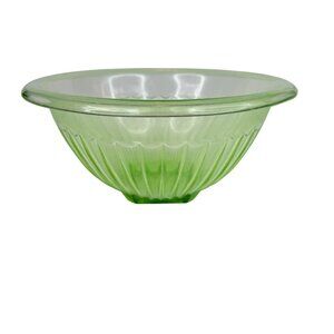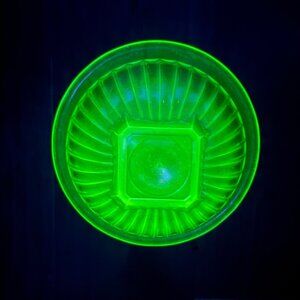 A vintage uranium glass bowl with ribbed design that fluoresces under UV light, ideal for collectors or unique decor enthusiasts.