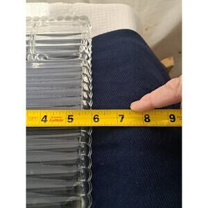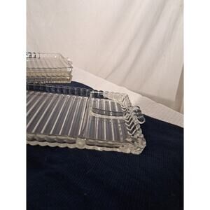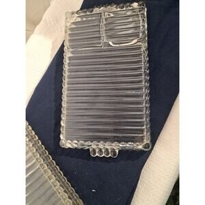 This vintage Hazel Atlas tray is a must-have for any collector. Featuring a unique "Smoke Sip and Snack" design with a ball and rib pattern, this rectangular tray is made of pressed glass. The tray is an original piece from the 1980s. The tray is perfect for serving snacks or small dishes and is sure to impress guests. With its classic design and vintage appeal, it would make a great addition to any kitchen or dining room. Don't miss out on the opportunity to own this rare piece of Hazel Atlas glassware.