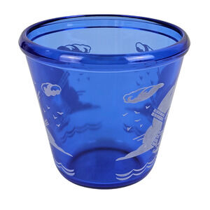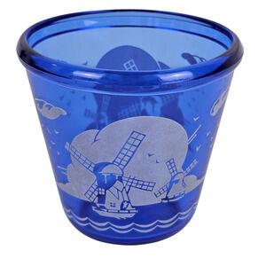 Vintage Hazel Atlas cobalt blue glass ice bucket has white painted windmills.
