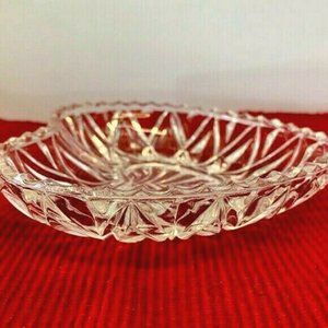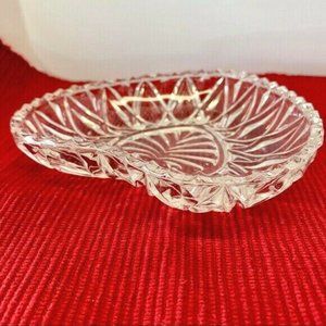 Beautiful saw tooth rim and pretty cut work details on this clear pressed glass dish in a heart shape, approx 6” x 5”