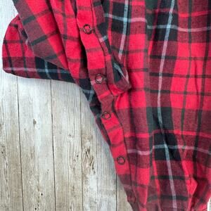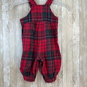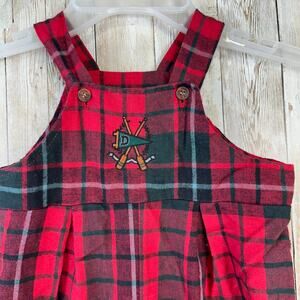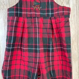 -Size 6/9-Red, Green tartan plaid, button closure, suspenders, embroidered accent.