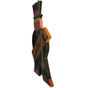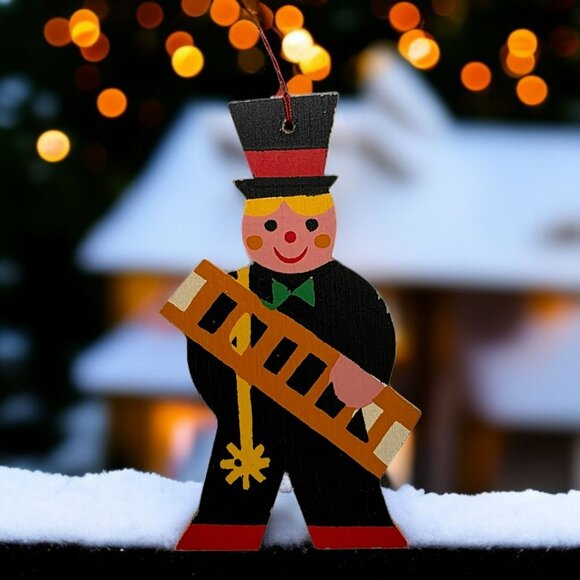 This vintage Heller wooden ornament adds a whimsical touch to holiday decor. Featuring a cheerful chimney sweep with a top hat and ladder.