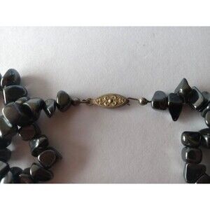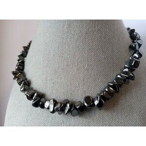 Condition-wise, I'll say that I'm not even sure this clasp was always on this piece. It is possible that someone carefully added it to give the piece some extra length. If so, they did it well / professionally and it doesn't look like a "hack job", if you will. As far as the actual necklace, it's gorgeous. The hematite chunks are heavy, they are shiny, and I see no overt signs of use just by looking at these chips. Overall, I would say it is in Very Good Condition.