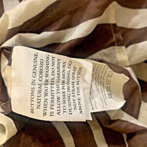This blouse has brown and beige zebra stripes, long sleeves, tan cuffs, and a collar with turquoise beads on the placket. The cuffs and collar are tan.