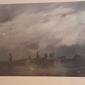 1980, signed and numbered by artist. Limited edition, 15" x 11 1/4" . Mounted on cardboard, sealed in plastic. Artist from Hampton Roads, Va. Features fishermen pulling nets at dawn.