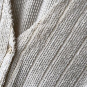 A rare deadstock chenille housecoat/robe in a gorgeous textured ivory—soft, plush, and effortlessly wearable. The vertical ribbing creates a long, clean line while the angled pockets flip the stripes for a subtle, intentional design moment. True vintage comfortwear with a modern, minimalist energy.
