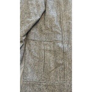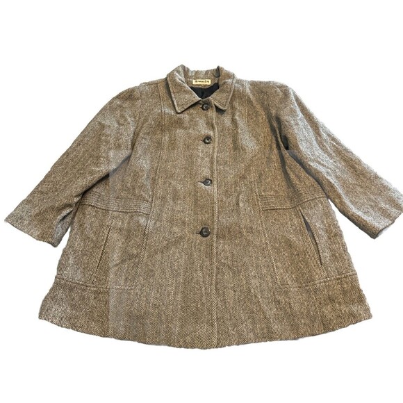 This vintage Herman Kay women's coat is a stylish addition to your wardrobe. The gray tweed wool blend fabric gives the coat a classic look, while the button closure and pockets add a touch of sophistication. The coat is a size 22P and is suitable for plus size types.