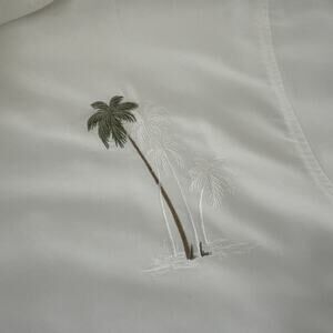 FEATURES: Embroidered palm trees; vintage; made in Hawaii; collared; button up