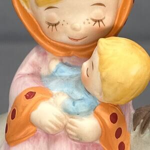 holy family decor, joseph mary baby jesus, religious christmas display, 1980s porcelain figurine, cottagecore decor, faith home accent, spiritual holiday display, collectible ceramic nativity, mid century inspired christmas decor, vintage christian gift, sentimental figurine, childs bedroom decor, gift, holiday creche, similar to precious moments, wholesome, nostalgic