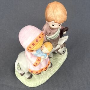 Charming vintage Homco porcelain nativity figurine featuring Mary holding baby Jesus on a donkey, led by Joseph. Soft hand-painted pastels and sweet expressions characteristic of 1980s Homco pieces. Labeled “Homco Made in Taiwan” with number 5608 on base.