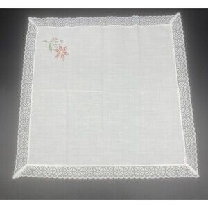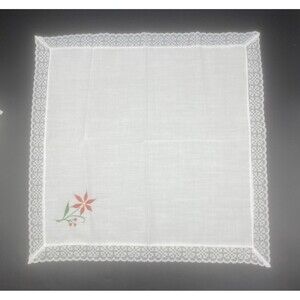 VTG Homemade White Cotton Napkins W/ Red & Green Flower & Lace Edge 16.5” -4 PC
