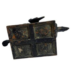 Cast iron or bronze. Might have been painted because there's gold popping through the black. Patina consistent with age. • Approx. 5.5" tall x 6" long x 2.5" wide