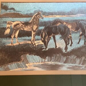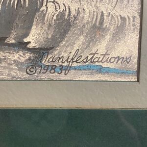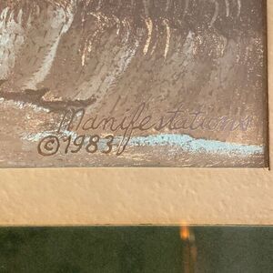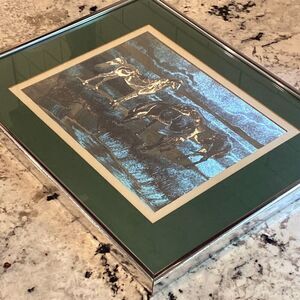Vintage Manifestations foil metallic art image of 3 horses. Beautiful iridescent effect. Frame is 14x11, image approx 9in x 7in. Green and ivory matboard within a silver frame with glass over top. Frame has some minor scuffs but item is overall great condition! Back of picture has letter from maker describing how it’s made, best effect, and care. Excellent unique addition to the equine lovers home!